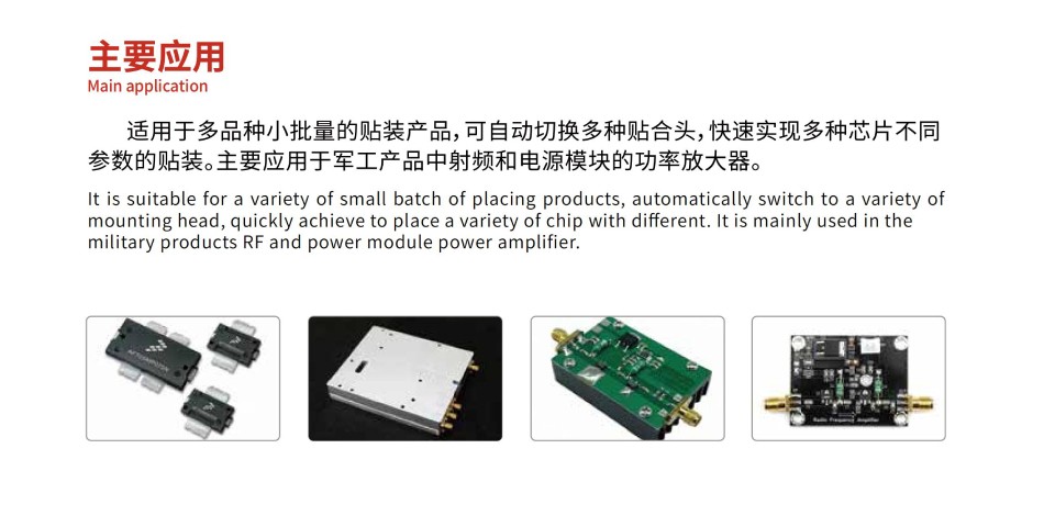 專用型高精度固晶貼合機(jī),適用于多品種小批量的貼裝產(chǎn)品,可自動切換多種貼合頭,快速實(shí)現(xiàn)多種芯片不同參數(shù)的貼裝。主要應(yīng)用于軍工產(chǎn)品中射頻和電源模塊的功率放大器。