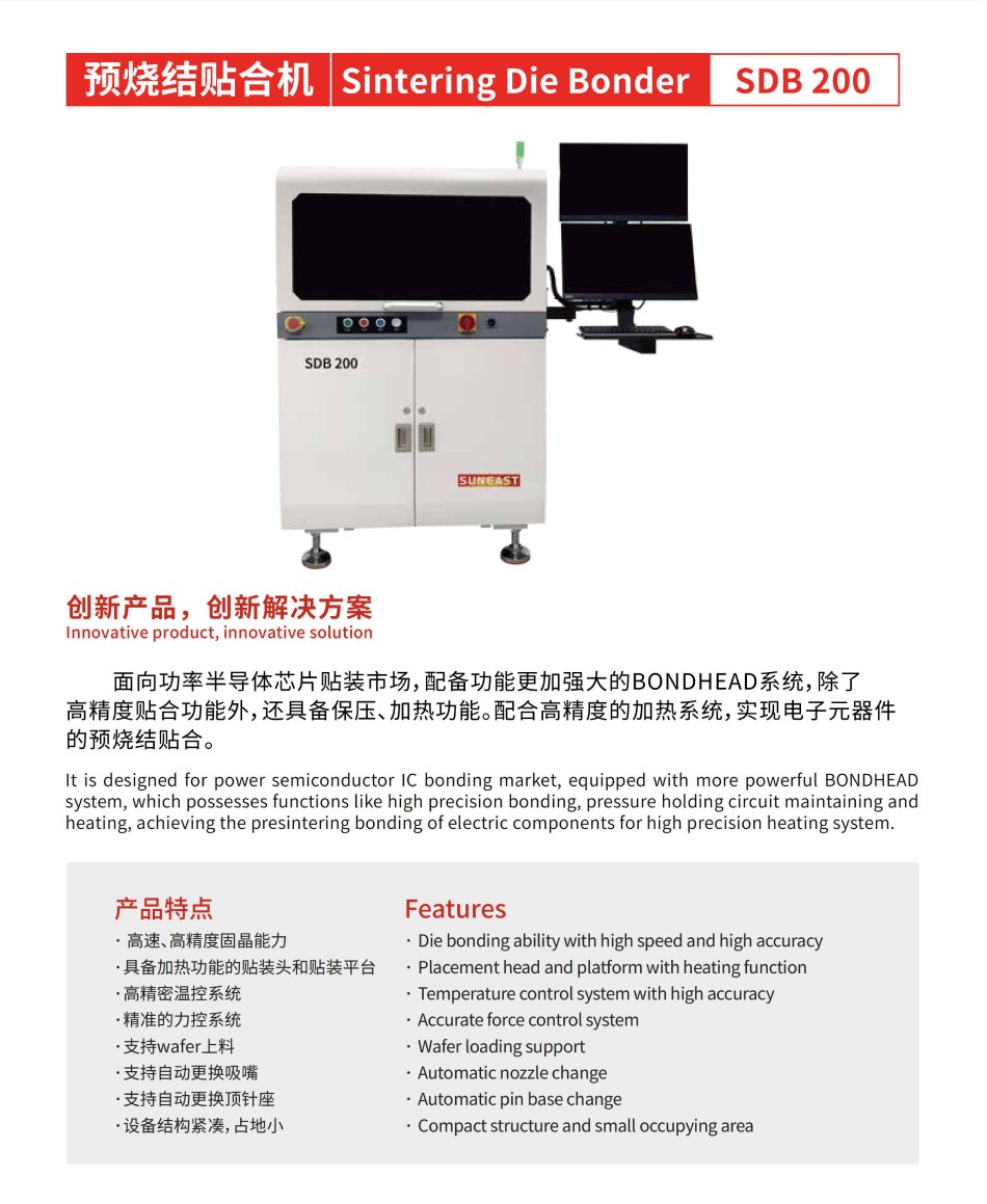 預燒結貼合機SDB200面向功率半導體芯片貼裝市場,配備功能更加強大的BONDHEAD系統,除了高精度貼合功能外,還具備保壓、加熱功能。配合高精度的加熱系統,實現電子元器件的預燒結貼合。