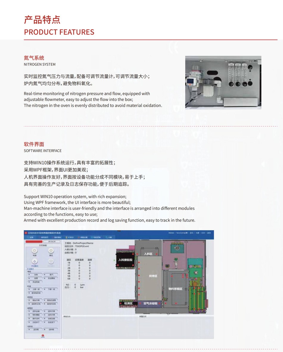 快速固化烤箱SE0-600N采用模塊化設計,集成自動化控溫,氮氣保護,緩沖冷卻,自動化上下料等多重功能。通過特定的溫度控制,氮氣控制,自動化操作,完成貼合設備后段的工藝制程,主要用于半導封裝過程中的固化與粘接工藝。
